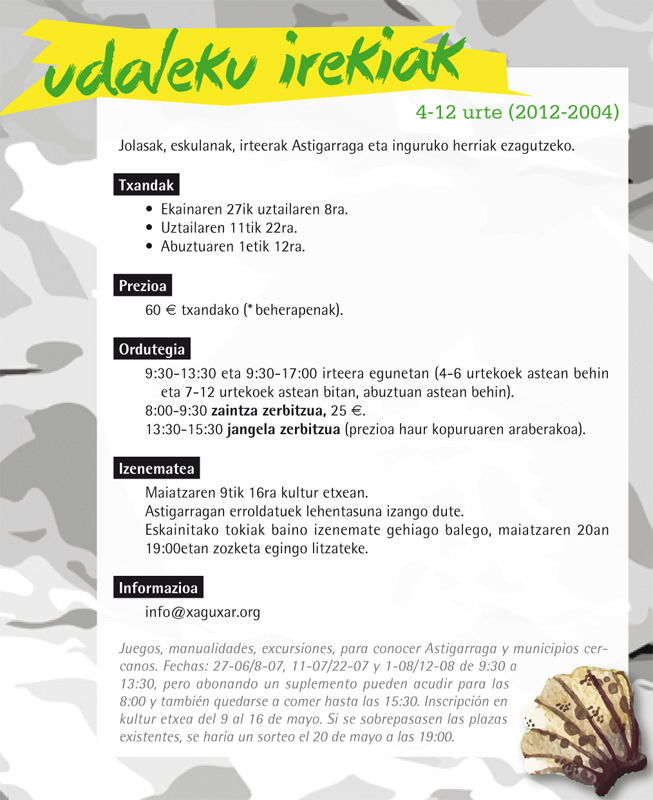 09:30-13:30 edo 09:30-17:00 irteera egunetan (4-6 urtekoek astean behin eta 7-12 urtekoek astean bitan)